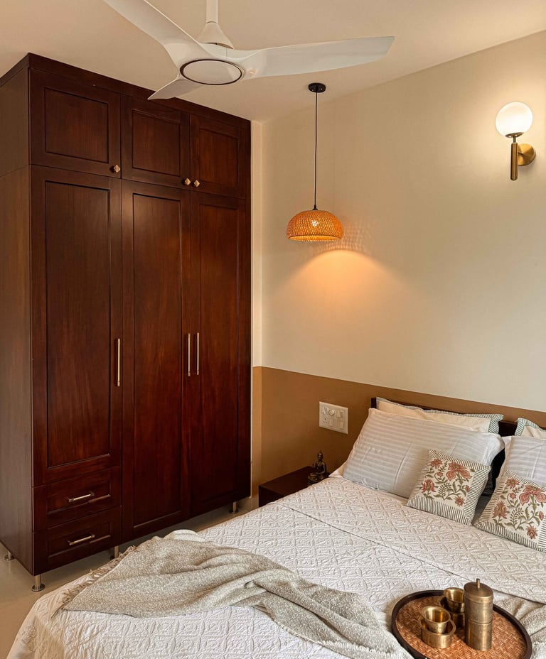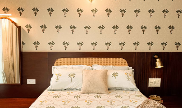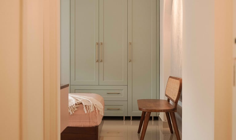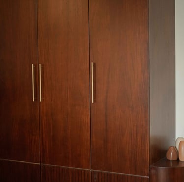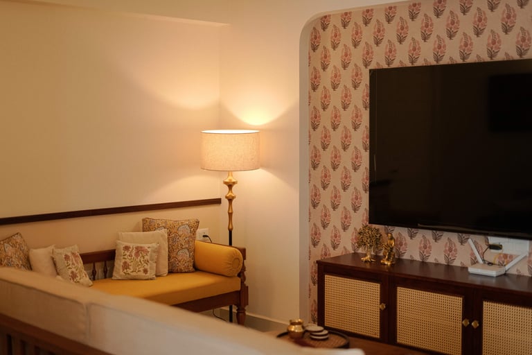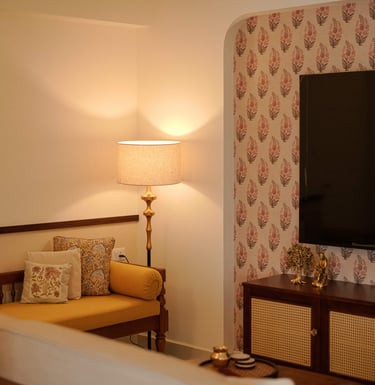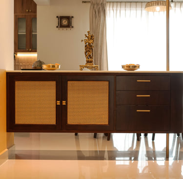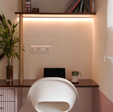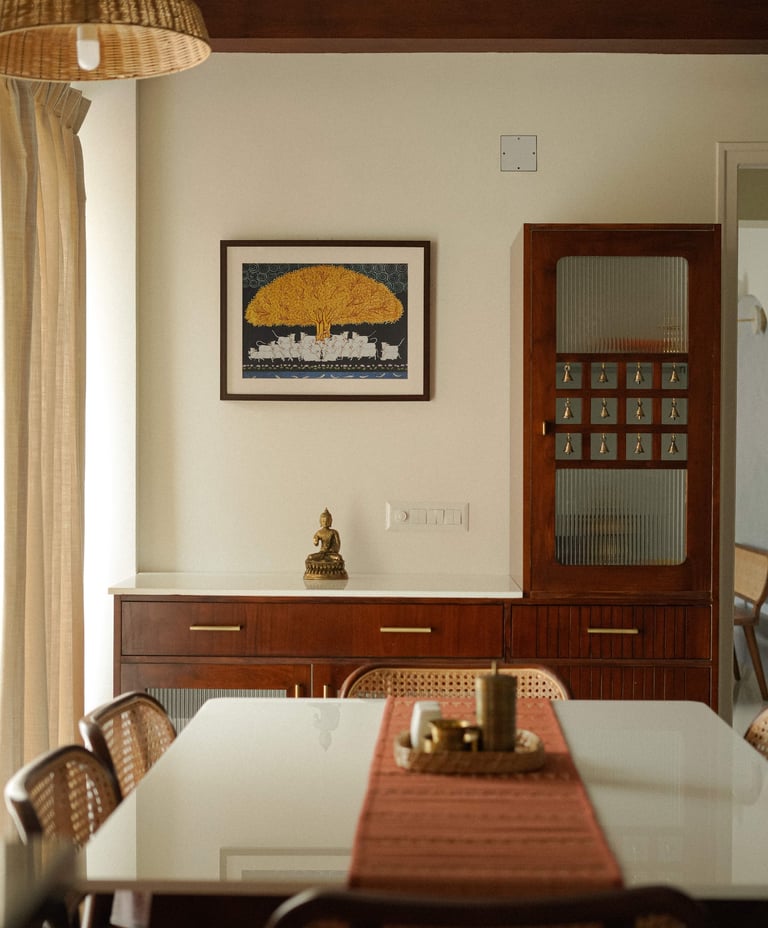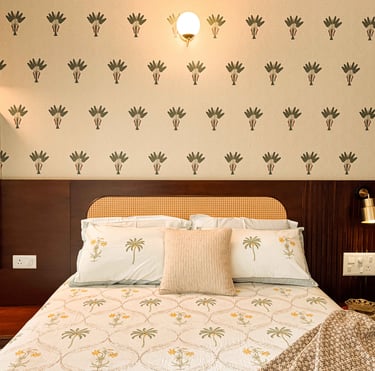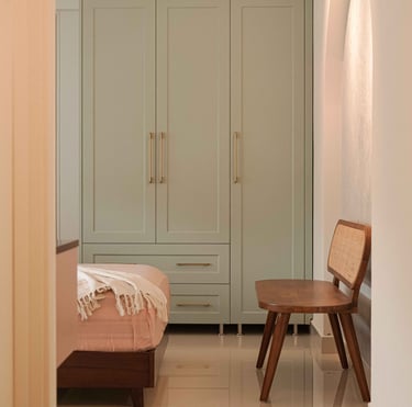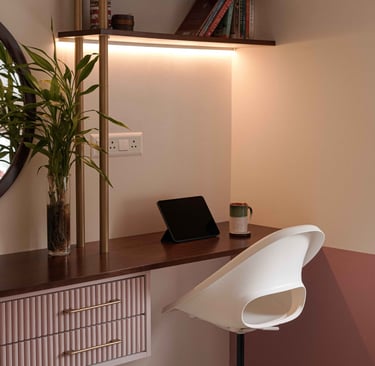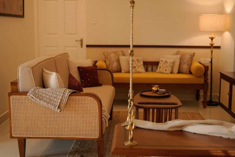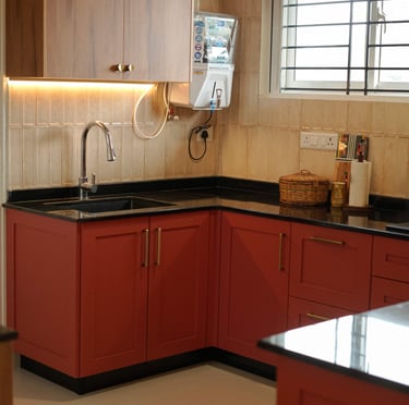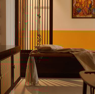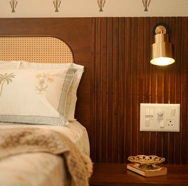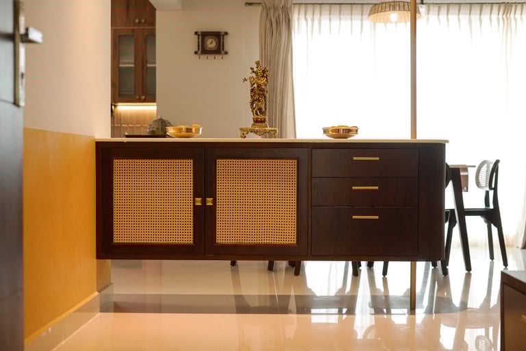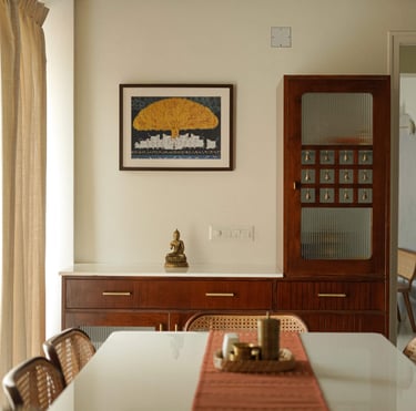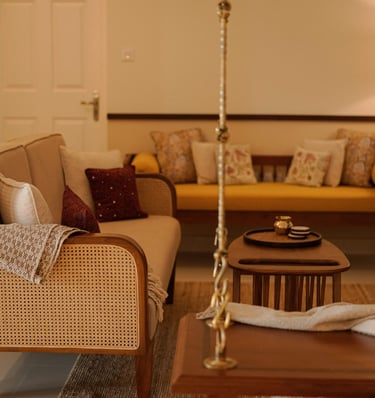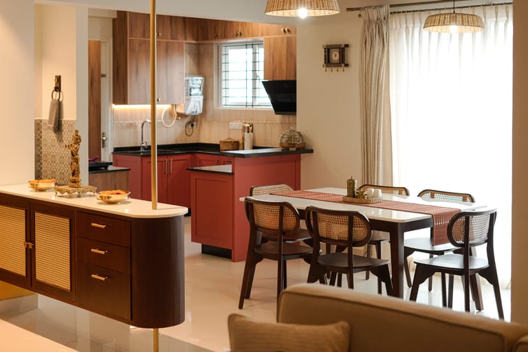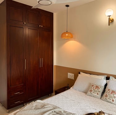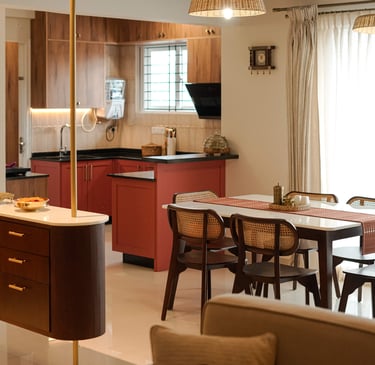 Nidhi's Nest is a home for a family of three designed with a contemporary style while incorporating Kerala Design elements. The project brief focused on creating spaces that feel like an extension of the nearby Kerala Temple. The use of earthy tones and simple, functional furniture ensures a comfortable, modern living environment, while also reflecting the cultural heritage of the temple. The design seamlessly blends the tranquil spiritual influence of the temple with the family's everyday needs.