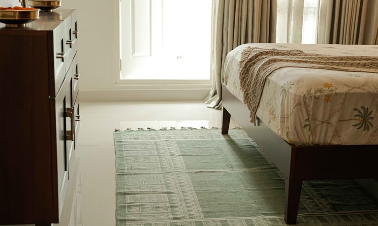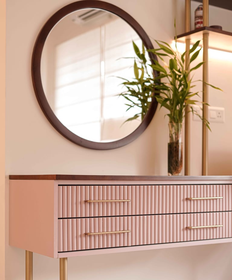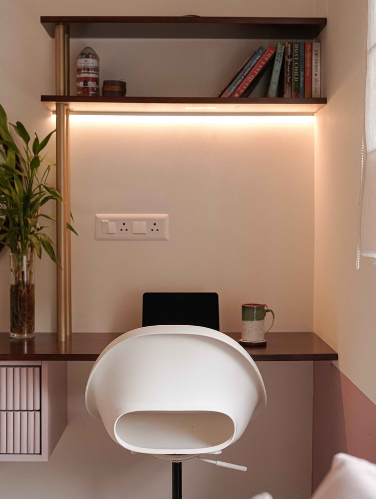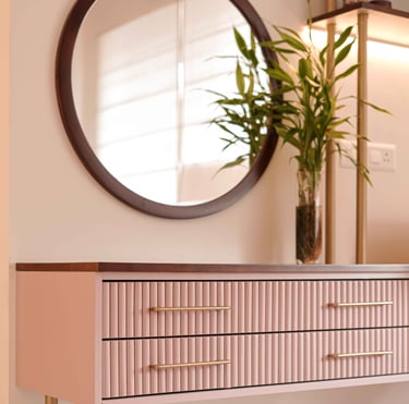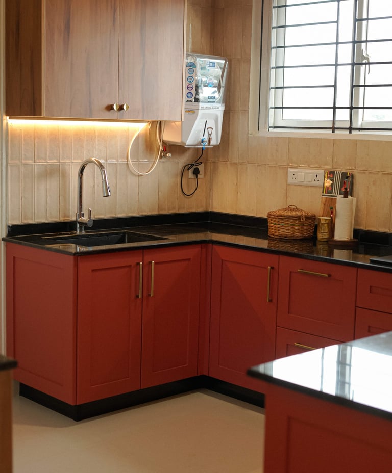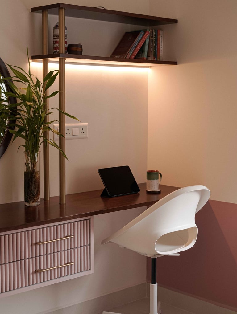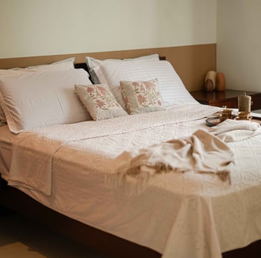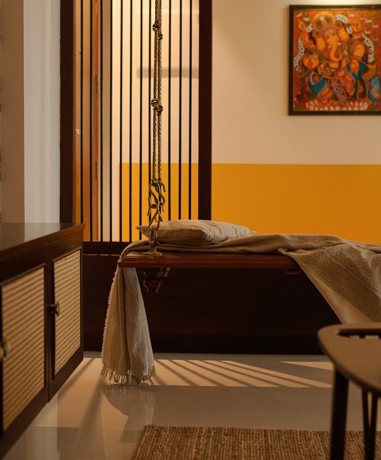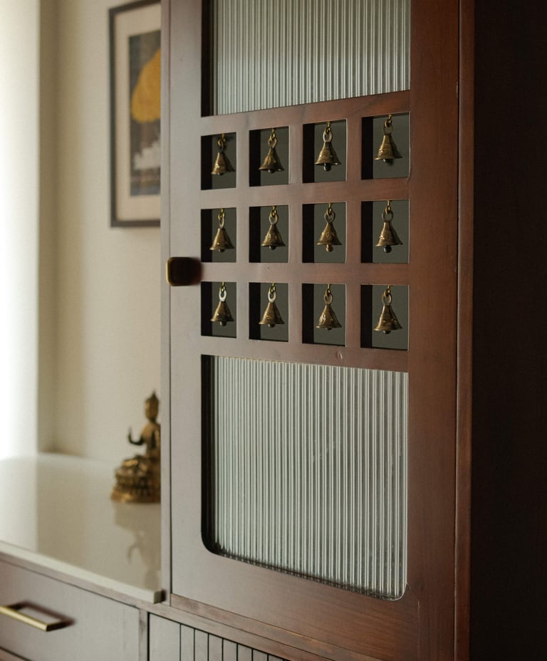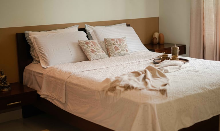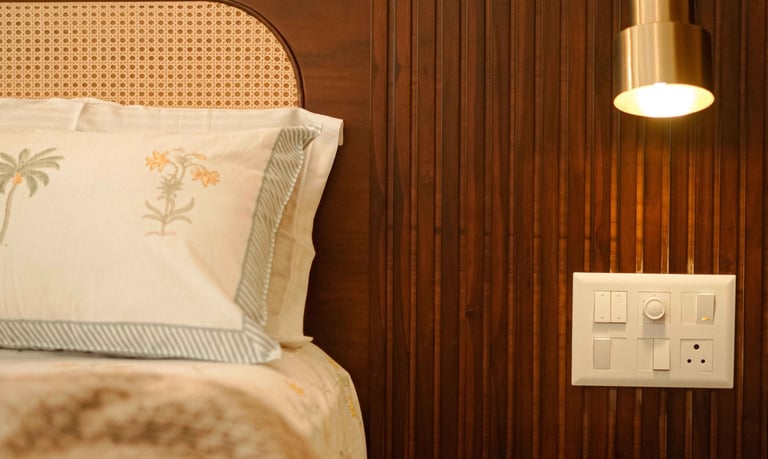 Nidhi's Nest is a home for a family of three designed with a contemporary style while incorporating Kerala Design elements. The project brief focused on creating spaces that feel like an extension of the nearby Kerala Temple. The use of earthy tones and simple, functional furniture ensures a comfortable, modern living environment, while also reflecting the cultural heritage of the temple. The design seamlessly blends the tranquil spiritual influence of the temple with the family's everyday needs.