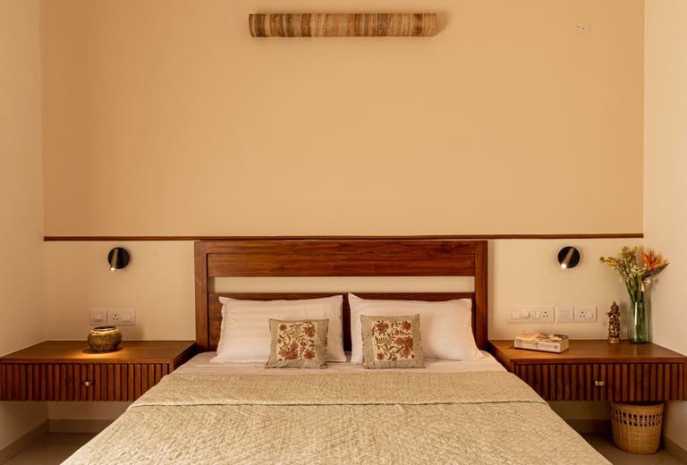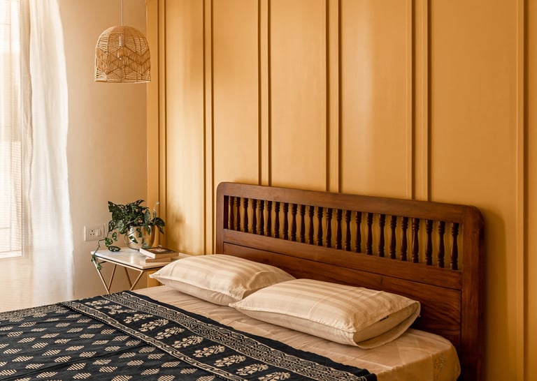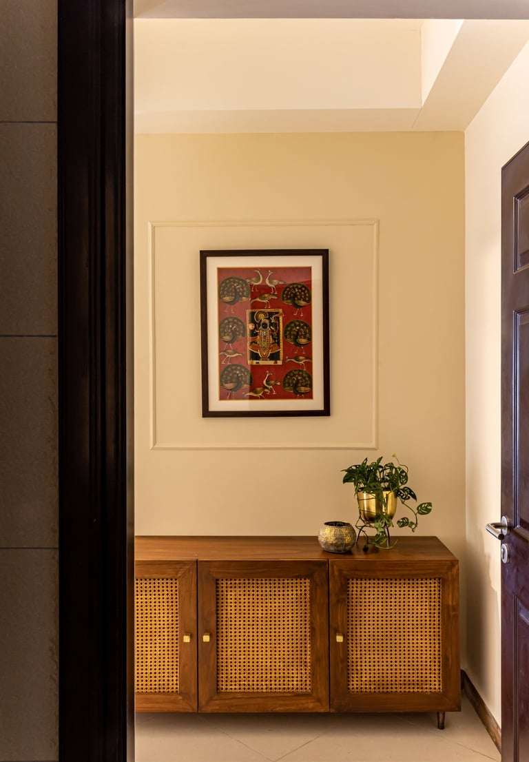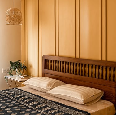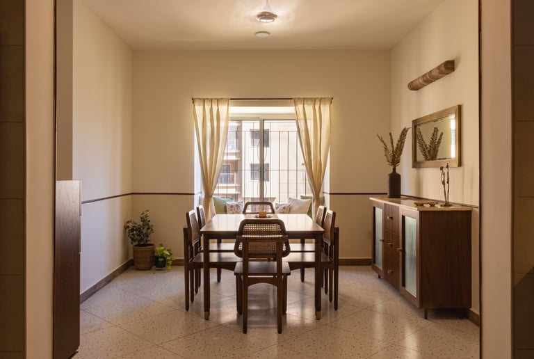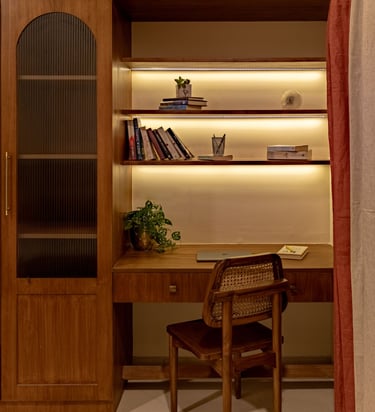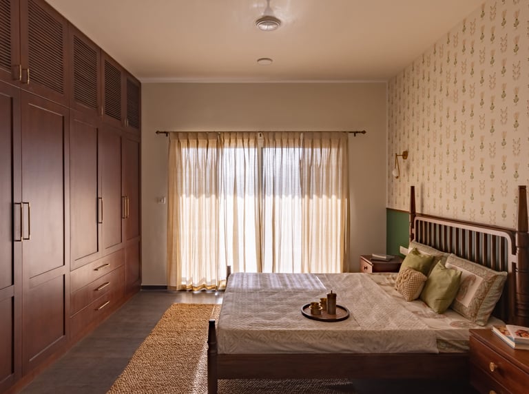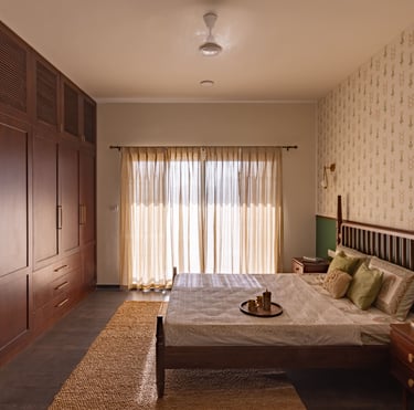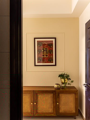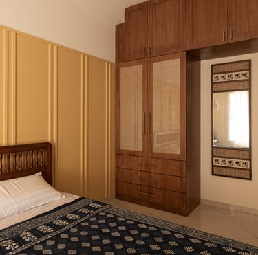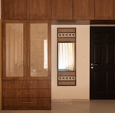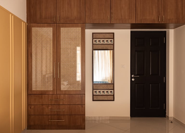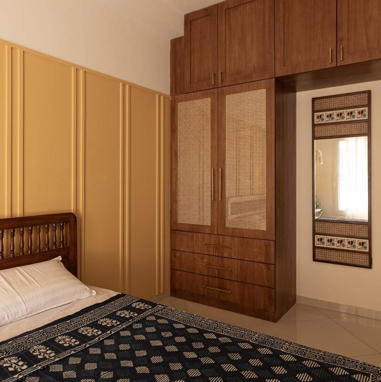 Project 4107 is a thoughtfully designed 3BHK home created for an NRI couple, offering them a serene and welcoming retreat during their occasional visits. The brief was clear: to create a minimalistic yet functional space that feels like a true home away from home. The design emphasizes warmth, comfort, and a sense of calm through the careful use of natural materials, such as rich wood finishes, elegant rattan accents, and a soothing palette of warm hues. The color palette plays a key role in creating a warm and inviting atmosphere, with soft neutrals, earthy tones, and subtle accents that reflect the couple’s desire for comfort and relaxation. Every room is carefully curated to balance aesthetics with functional living, making the home both stylish and practical for their limited time spent in it.